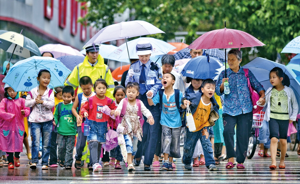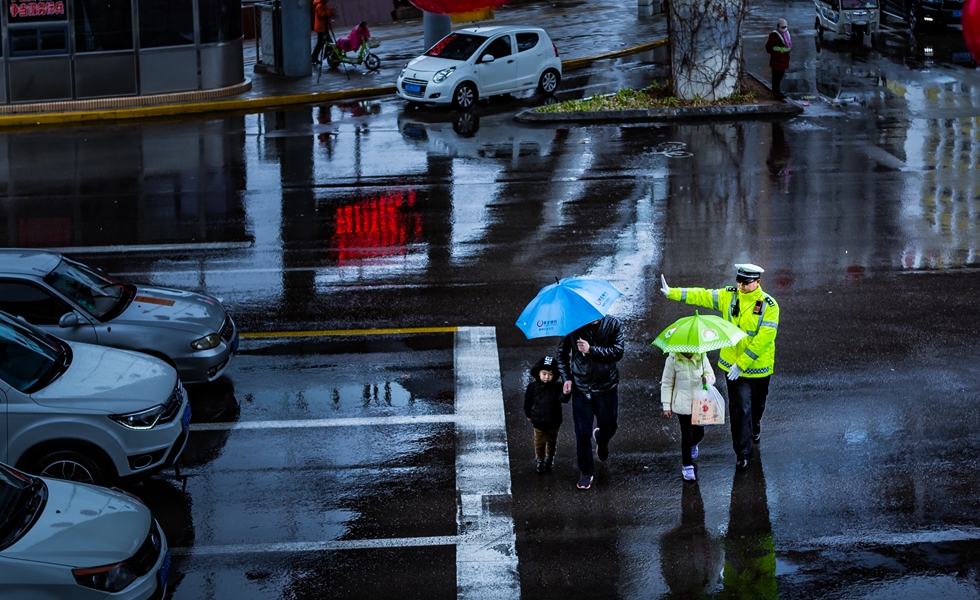 執(zhí)勤民警雨中護(hù)送小學(xué)生過馬路/