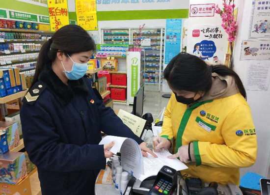 在零售藥店,他們張貼禁售發(fā)熱、止咳藥品的通知,并逐一進行檢查,保持禁售藥品沒有在售的同時維持防疫用品價格的穩(wěn)定。