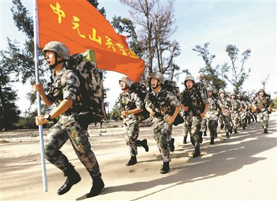 陸軍某海防旅“中元山英雄連”官兵重裝拉練。 李駿 攝