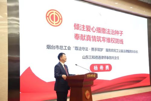 11月9日,第七屆“全國維護(hù)職工權(quán)益杰出律師”表彰暨“尊法守法·攜手筑夢”服務(wù)農(nóng)民工公益法律服務(wù)行動總結(jié)會在北京召開。會上,煙臺市總工會“尊法守法 攜手筑夢”服務(wù)農(nóng)民工公益法律服務(wù)隊(duì)隊(duì)長楊希勇在做典型交流發(fā)言時如是說。