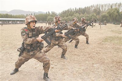某旅直招士官孫崇惠(左一)帶隊進行刺殺訓(xùn)練。郭華輝 攝