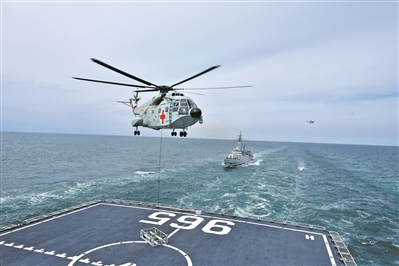 說(shuō)話間,一架直升機(jī)凌空而來(lái),懸停在呼倫湖艦后甲板上空。保障人員迅速將彈藥箱掛上直升機(jī)吊索,直升機(jī)旋即轉(zhuǎn)運(yùn)至受補(bǔ)艦。
