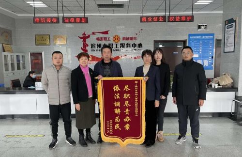 人民網(wǎng)濱州1月22日電 “娘家人‘猴賽雷’,我們?yōu)闉I州工會(huì)的調(diào)解點(diǎn)贊!本來以為我們31個(gè)人的工資春節(jié)前能拿到就不錯(cuò)了,沒想到三天時(shí)間就到手了”。1月20日,廣東籍職工何某某操著一口廣東方言邊感謝邊把一面寫有“盡職盡責(zé)辦案,依法調(diào)解為民”的錦旗送到濱州市總工會(huì)職工服務(wù)中心大廳工作人員手中。