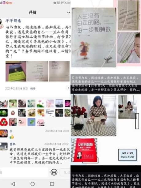 蘭山農(nóng)商銀行工會(huì)舉辦首屆女職工讀書(shū)節(jié)活動(dòng),活動(dòng)以“與書(shū)為友,閱讀經(jīng)典。感知成長(zhǎng),共享收獲”為主題,以朋友圈打卡的形式開(kāi)展。全體女職工積極參與到讀書(shū)節(jié)活動(dòng)中來(lái),在朋友圈里相互點(diǎn)贊、相互討論、相互鼓勵(lì),共同分享閱讀的樂(lè)趣。