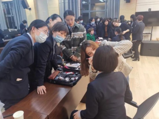 河?xùn)|農(nóng)商銀行工會(huì)組織開(kāi)展“扮靚容顏,做魅力女神”化妝培訓(xùn)活動(dòng),邀請(qǐng)化妝培訓(xùn)師為女職工講授基本化妝知識(shí)。培訓(xùn)老師用通俗易懂的語(yǔ)言介紹皮膚結(jié)構(gòu),分析肌膚問(wèn)題及護(hù)膚建議,通過(guò)對(duì)彩妝步驟講解、分組現(xiàn)場(chǎng)演示方式,幫助女職工掌握塑造干練、靚麗的職業(yè)妝面的化妝技巧,引導(dǎo)她們?cè)诠ぷ骱蜕钪懈玫恼宫F(xiàn)優(yōu)雅、靚麗的風(fēng)采。