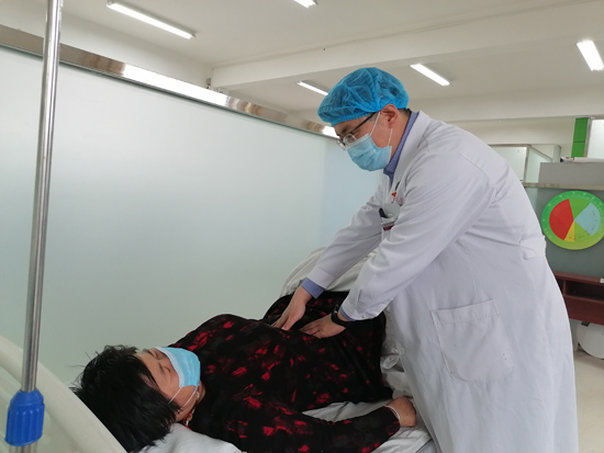 普通外科(胃腸)醫(yī)生戴慶濤為患者查體,并幫她現(xiàn)場(chǎng)聯(lián)系了住院床位