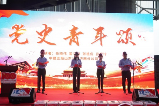 同時,為推動黨史學(xué)習(xí)教育在產(chǎn)業(yè)工人群體中廣泛開展,增強(qiáng)一線建設(shè)者們學(xué)黨史的主動性、積極性,中建五局山東公司貼心準(zhǔn)備了一場別開生面的《黨史青年頌》,由四名項(xiàng)目青年員工組成的“紅心”青年宣講隊(duì)上臺朗誦黨史歷程詩歌,在飽含感情的字句中,黨史知識和發(fā)展歷程逐漸流進(jìn)了工人的腦海里、心坎里。