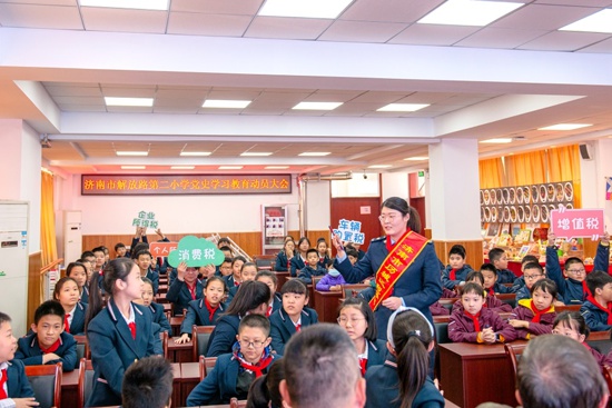 走進(jìn)小學(xué),開展“稅務(wù)藍(lán)牽手紅領(lǐng)巾 黨史稅史潤童心”活動。(歷城區(qū)稅務(wù)局供圖)