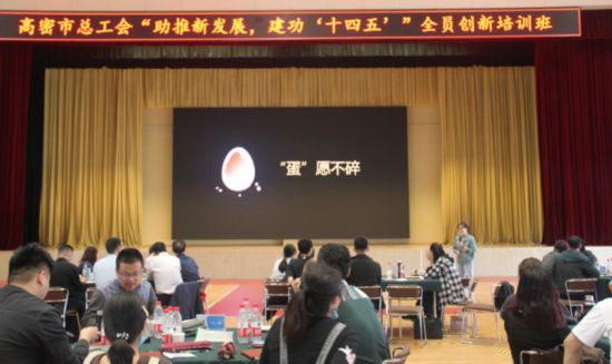 這是日前在高密市總工會舉辦的“助推新發(fā)展,建功十四五”全員創(chuàng)新培訓課上,豪邁職業(yè)學院培訓教師設計的“‘蛋’愿不碎”創(chuàng)新挑戰(zhàn)環(huán)節(jié)。