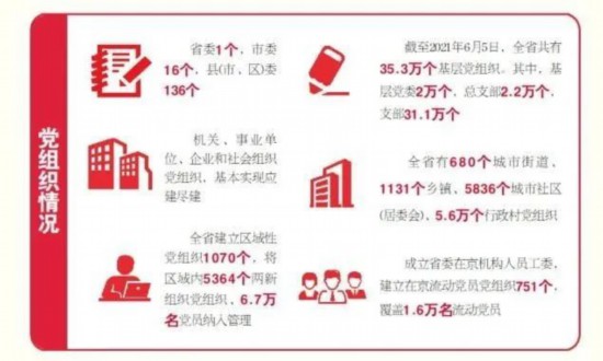 黨的組織和工作覆蓋不斷擴大。持續(xù)開展全域組織覆蓋行動,全省基層黨組織總量比1949年的4.2萬個,增長約7.4倍。現(xiàn)有基層黨組織中,基層黨委2萬個、總支部2.2萬個、支部31.1萬個。全省有680個城市街道、1131個鄉(xiāng)鎮(zhèn)、5836個城市社區(qū)(居委會)、5.6萬個行政村黨組織,國有企業(yè)、機關(guān)事業(yè)單位、非公有制經(jīng)濟組織和社會組織黨組織基本實現(xiàn)應(yīng)建盡建。成立省委在京機構(gòu)人員工委,建立在京流動黨員黨組織751個,覆蓋1.6萬名流動黨員。
