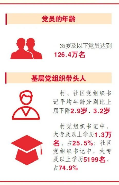 黨員隊伍結(jié)構(gòu)持續(xù)優(yōu)化。全省共有女黨員162.9萬名,占黨員總數(shù)的23.2%;大專及以上學(xué)歷黨員308.3萬名,占44%;少數(shù)民族黨員4.5萬名,占0.6%。隊伍年齡結(jié)構(gòu)不斷改善,35歲以下黨員達到126.4萬名。基層黨組織帶頭人素質(zhì)進一步提升,今年村和社區(qū)“兩委”換屆選舉工作基本完成后,村、社區(qū)黨組織書記平均年齡分別比上屆下降2.9歲、3.2歲;村黨組織書記中,大專及以上學(xué)歷1.3萬名、占25.5%;社區(qū)黨組織書記中,大專及以上學(xué)歷5199名、占74.9%。