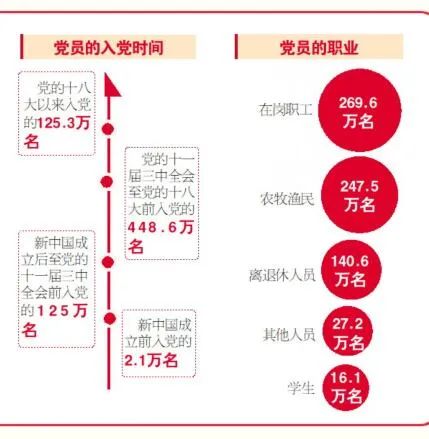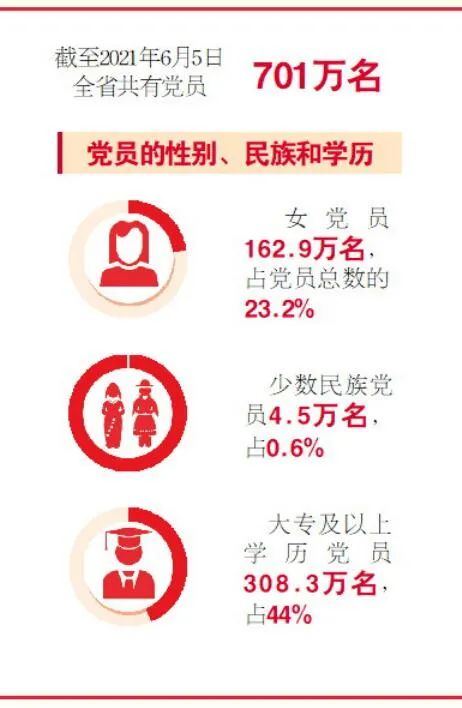 黨員數(shù)量穩(wěn)步增長。按照控制總量、優(yōu)化結(jié)構(gòu)、提高質(zhì)量、發(fā)揮作用的總要求,突出政治標(biāo)準,嚴把黨員入口,明確不得發(fā)展入黨的20條負面清單,確保好中選優(yōu)。全省黨員總量比1949年的75.4萬名,增長約8.3倍。黨員隊伍中,在崗職工269.6萬名、占38.5%;農(nóng)牧漁民247.5萬名、占35.3%;學(xué)生16.1萬名、占2.3%;離退休人員140.6萬名、占20%;其他人員27.2萬名、占3.9%。