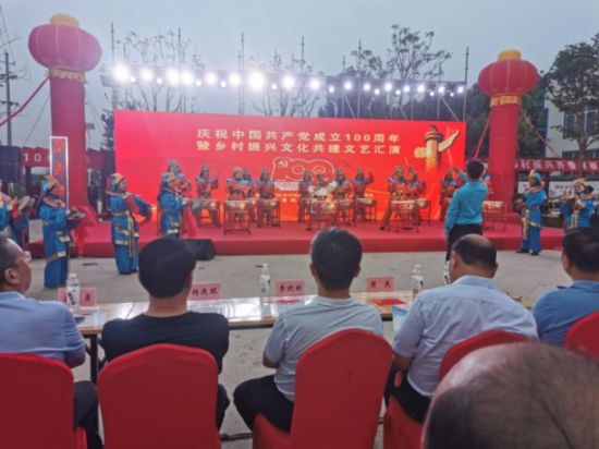 為慶祝黨的百年華誕,展示服務(wù)隊(duì)與濟(jì)南市豫劇團(tuán)在各幫服村進(jìn)行進(jìn)行文化振興、文化共建的成果,6月27日晚,服務(wù)隊(duì)在潘莊村舉辦了“慶祝中國共產(chǎn)黨成立100周年暨鄉(xiāng)村振興文化共建文藝匯演”。經(jīng)過對(duì)各村村民進(jìn)行三個(gè)月的文藝培訓(xùn),各村的學(xué)員們你方唱罷我登場,表演形式多樣,既有開場就掀起高潮的振興鑼鼓,又有頗見功底的豫劇清唱;既有悠揚(yáng)婉轉(zhuǎn)的葫蘆絲合奏,又有獨(dú)具特色的扇子舞。豫劇團(tuán)也專門為鄉(xiāng)村振興工作創(chuàng)作了戲劇聯(lián)唱《鄉(xiāng)村振興砥礪前行》和小品《值錢了》,反映了省派長清區(qū)鄉(xiāng)村振興服務(wù)隊(duì)在2年里的部分工作成績,讓觀眾們更為直觀地解了服務(wù)隊(duì)在鄉(xiāng)村振興工作中的奉獻(xiàn)與付出。