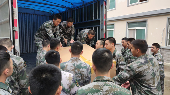 河南省的部隊(duì)官兵從貨車上搬運(yùn)救援艇