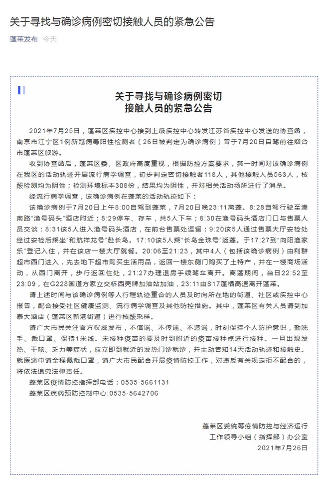 人民網(wǎng)煙臺(tái)7月26日電(聶俊穹)26日,據(jù)中國(guó)共產(chǎn)黨蓬萊市委員會(huì)宣傳部微信公眾號(hào)“蓬萊發(fā)布”消息,2021年7月25日,山東省煙臺(tái)市蓬萊區(qū)疾控中心接到上級(jí)疾控中心轉(zhuǎn)發(fā)江蘇省疾控中心發(fā)送的協(xié)查函,南京市江寧區(qū)1例新冠病毒陽性檢測(cè)者(26日被判定為確診病例)曾于7月20日自駕前往煙臺(tái)市蓬萊區(qū)旅游。