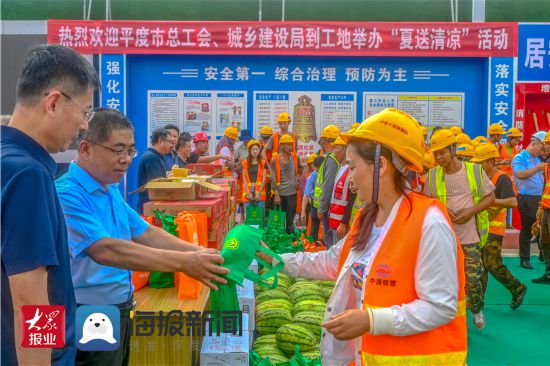 在活動(dòng)現(xiàn)場(chǎng),青島平度市總工會(huì)、平度市城鄉(xiāng)建設(shè)局為為項(xiàng)目施工的工友們送去礦泉水、毛巾、肥皂、西瓜等防暑降溫物資,向奮戰(zhàn)在戶外高溫一線的職工表示慰問。