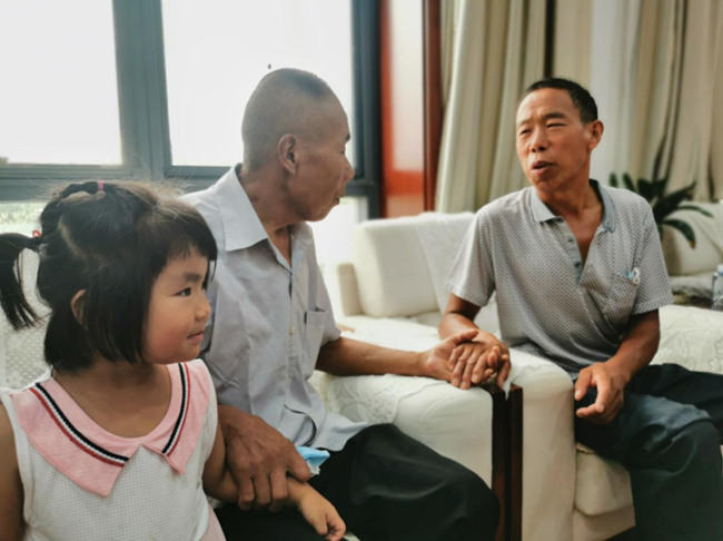 7月26日上午,兄弟二人抓著手,緊鄰而坐,輪流說著家里的情況;在另一邊,他們的兒女們也坐在一起,拿著照片,介紹家里人,然后互加了微信;他們兄弟二人的妻子,也在一旁攀談,孫子、孫女們在一旁互相打鬧。