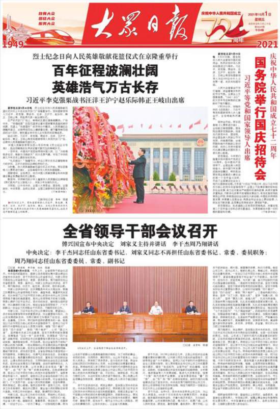 9月30日 上午,全省領(lǐng)導(dǎo)干部會議召開。中央組織部副部長、國家公務(wù)員局局長傅興國出席會議并宣布中央決定:李干杰同志任山東省委書記,劉家義同志不再擔(dān)任山東省委書記、常委、委員職務(wù);周乃翔同志任山東省委委員、常委、副書記。劉家義主持會議并講話,李干杰、周乃翔講話,付志方、趙志浩、陳光林、楊東奇出席。