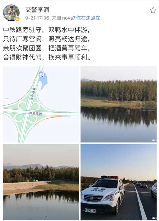 李涌是一名擁有2.6萬微博粉絲的”青島交警大V“,半個月前的中秋小長假,李涌也堅持在崗值班,并在微博上這樣寫道:“中秋路旁駐守,雙鴨水中伴游。只待廣寒宮闕,照亮暢達歸途。親朋歡聚團員,把酒莫再駕車。舍得財神代價,換來事事順利!