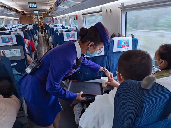 10月6日王偉燕穿上那身紫氣東來的工裝,戴上列車長的臂章,帶領(lǐng)班組職工踏上她心愛的高鐵列車。王偉燕深知作為一名高鐵列車長,她必須做到“一專多能”,乘客病了,她是急救醫(yī)生;孩子哭了,她是保姆;乘客發(fā)脾氣,她是出氣筒;列車晚點(diǎn),她是鞠躬道歉的“責(zé)任人”。面對(duì)各式各樣的旅客,她既要做到堅(jiān)持原則,更要做到寬容大度。