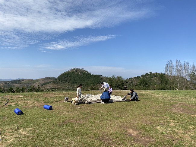 游客們在崮上草原野營搭起野營的帳篷
