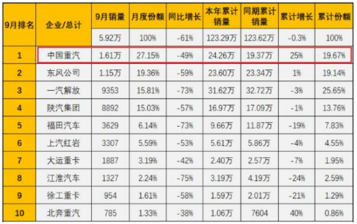 9月,一般來說是重卡市場走出淡季、迎來旺季的月份。但今年的9月“含金量”實在不足,重卡行業(yè)總銷量僅為5.92萬輛,同比下降61%,與8月份的降幅一致。中國重汽在9月則取得了1.61萬輛的銷量成績,拿下27.2%的單月市場份額,成功衛(wèi)冕單月銷量冠軍,實現(xiàn)重卡銷量“三連冠”。