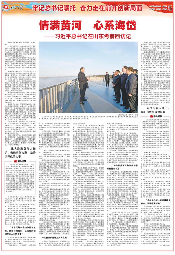 情滿黃河,心系海岱。習(xí)近平總書記帶著深邃思考和深情厚望,奔波于大河兩岸、渤海之濱。從他的凝思里,我們看到了運(yùn)籌帷幄、巨筆擘畫的雄韜偉略;從他的部署里,我們看到了母親河造福民族、造福百姓的美好圖景徐徐鋪展;從他的關(guān)切里,我們看到了大黨大國領(lǐng)袖深厚的人民情懷;從他的囑托里,我們感受到了開創(chuàng)新時(shí)代社會(huì)主義現(xiàn)代化強(qiáng)省建設(shè)新局面的強(qiáng)大動(dòng)力。
