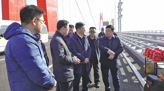 曹殿軍(前排右二)調(diào)研濟南鳳凰路黃河大橋建設(shè)情況。