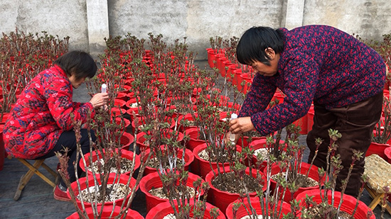 大棚內(nèi)花農(nóng)正在用藥劑調(diào)節(jié)花蕾的發(fā)育。劉祺攝