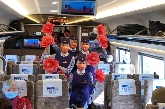 車廂內(nèi)乘務(wù)員為乘客表演才藝。劉祺攝