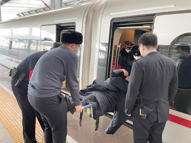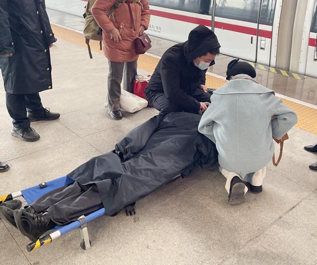 車站工作人員一起將旅客抬下列車。不顧寒冷,客運(yùn)員脫下工作服蓋在患者身上。劉瑤攝