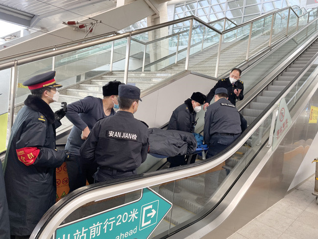 10時(shí)18分,候車室值班員周玉潔帶領(lǐng)兩名從事醫(yī)務(wù)工作的熱心旅客到達(dá)站臺(tái)查看患病旅客情況,經(jīng)熱心旅客指導(dǎo)決定先下車再處理,喬卓鋮怕旅客受涼,立即脫下身上的工作服蓋在患者身上,并與工作人員一起將其抬送至重點(diǎn)旅客候車室等待120的到來。