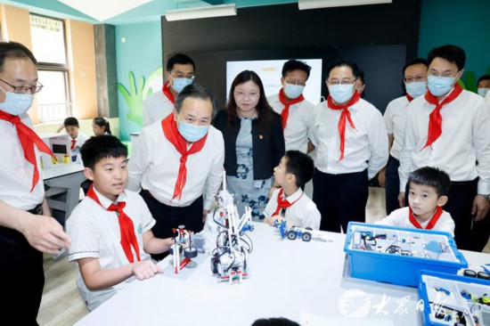 李干杰首先來到市中區(qū)海珀幼兒園,這是一所全日制公辦幼兒園,設(shè)有9個(gè)教學(xué)班。李干杰詳細(xì)察看幼兒園設(shè)施環(huán)境,走進(jìn)教室與小朋友們親切互動(dòng)交流,祝大家節(jié)日快樂,希望大家健康快樂成長。隨后,李干杰來到市中區(qū)泉欣小學(xué),少先隊(duì)員為其佩戴紅領(lǐng)巾。他詳細(xì)了解學(xué)校教育教學(xué)、社團(tuán)活動(dòng)、課后服務(wù)與疫情防控情況,參觀學(xué)生畢業(yè)課題展、科技發(fā)明創(chuàng)造、合唱團(tuán)演唱等,與學(xué)生交流科技發(fā)明、課外活動(dòng)的心得體會(huì)。