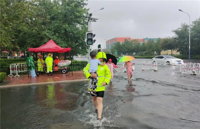 “你們站著別動(dòng),我過來,別怕??!”執(zhí)勤交警對(duì)馬路對(duì)面的母子喊道。該路段積水較深,母子倆站在積水中不敢前行。執(zhí)勤交警卷起褲腿、脫掉鞋子,赤腳蹚過積水,抱起孩子送到路邊。