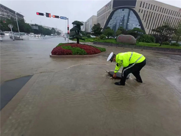為保障道路暢通,確保群眾出行安全,他們始終奮戰(zhàn)在雨中,路遇積水排污不暢,他們徒手清理堵塞的下水口。