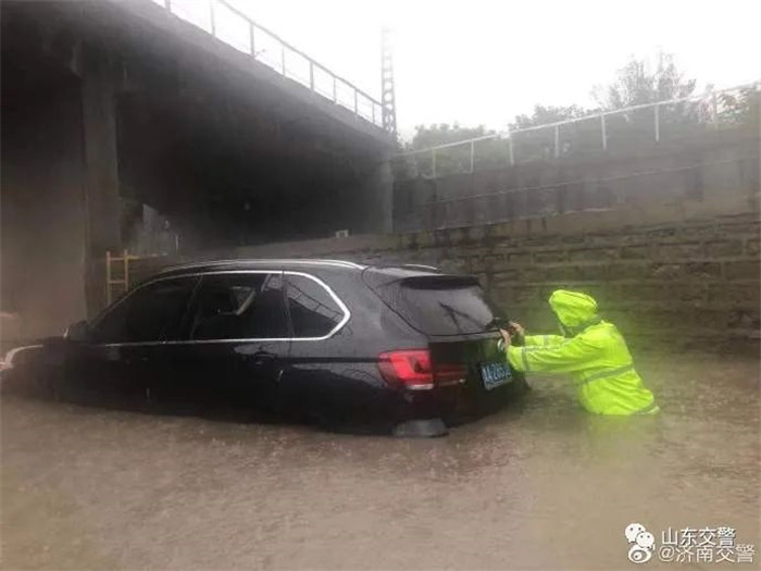 8月8日晨,濱州交警在人車流量較大的路口增派警力指揮疏導(dǎo)交通,同時(shí)在積水嚴(yán)重路口、路段開啟警燈和喊話器警示,提醒駕駛?cè)俗⒁狻跋匏?、亮尾、控距”等安全措施,并幫助受困群眾“過河”。