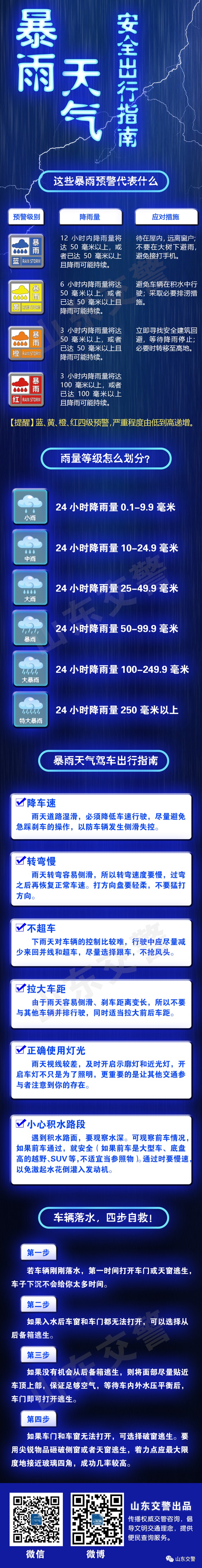 山東交警提醒,降雨天氣仍將持續(xù),請(qǐng)廣大駕駛?cè)俗⒁?,行車一定要減速慢行,切勿爭道搶行,車輛經(jīng)過積水路段,請(qǐng)確認(rèn)安全后再慢行通過,切勿強(qiáng)行涉水通過。