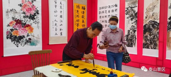 泰安市楹聯(lián)詩詞協(xié)會(huì)名譽(yù)會(huì)長(zhǎng)、原泰山景區(qū)管委會(huì)主任戴有奎,泰山景區(qū)黨工委副書記萬慶海,泰安市楹聯(lián)詩詞協(xié)會(huì)會(huì)長(zhǎng)劉慧君,泰安市青年書法家協(xié)會(huì)副會(huì)長(zhǎng)兼秘書長(zhǎng)魏兆征,泰山景區(qū)老年體育協(xié)會(huì)副會(huì)長(zhǎng)牛毅然,山東五岳園林市政公司董事長(zhǎng)韋中樸,以及來自泰山藝術(shù)聯(lián)盟、泰山山水畫創(chuàng)作院、泰山區(qū)青年書法家協(xié)會(huì)的藝術(shù)家代表和中外游客參加活動(dòng)。