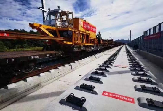 為確保鋪軌任務(wù)順利進(jìn)行,自全線開鋪以來(lái),在山東鐵投濰煙高鐵公司兩個(gè)現(xiàn)場(chǎng)指揮部通力協(xié)作和精心管理下,各參建單位發(fā)揮黨建引領(lǐng)重要作用,緊密配合、科學(xué)組織、攻堅(jiān)克難,確保了線下工程、架梁通道和無(wú)砟軌道等一個(gè)個(gè)重要節(jié)點(diǎn)的實(shí)現(xiàn)。鋪軌施工單位中鐵一局克服鄰近營(yíng)業(yè)線施工安全風(fēng)險(xiǎn)高、穿越龍煙線運(yùn)輸距離長(zhǎng),昌邑段上跨濰萊線“天窗點(diǎn)”作業(yè)有限空間,煙臺(tái)段頻繁穿越隧道,通過(guò)鬧市區(qū)、單線梁、大坡道及線下施工條件限制等諸多困難和挑戰(zhàn),開展晝夜雙班施工,全體人員以“??⒐?促進(jìn)度 筑精品”勞動(dòng)競(jìng)賽活動(dòng)為契機(jī),戰(zhàn)高溫、冒驟雨、搶工期,提前完成線路交接、軌道扣件預(yù)安裝、各車站無(wú)砟道岔鋪設(shè)、劉家線路所接軌點(diǎn)鋪設(shè)以及濰煙線與青煙線的上下行聯(lián)絡(luò)線道床施工任務(wù),全面打通了鋪軌通道,保證了全線正線鋪軌任務(wù)的順利完成。期間,創(chuàng)造了昌邑段單日雙班鋪軌12.5公里,煙臺(tái)段單班12小時(shí)鋪軌12.5公里的“濰煙速度”。