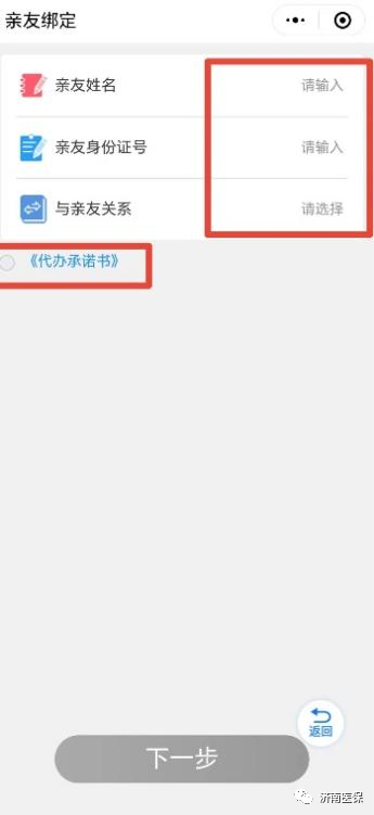 2.選擇添加親友綁定,填寫親友姓名,親友身份證號,與親友關系等內(nèi)容;勾選《代辦承諾書》。