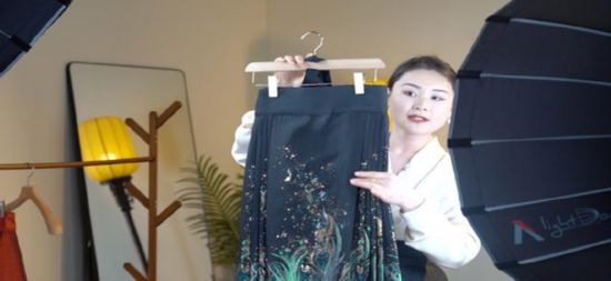 曹縣數(shù)字經(jīng)濟產(chǎn)業(yè)園內(nèi),主播正在直播間介紹馬面裙。