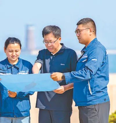 孟凌峰(中)與同事在研究海岸線修復(fù)工程圖。張海鵬攝