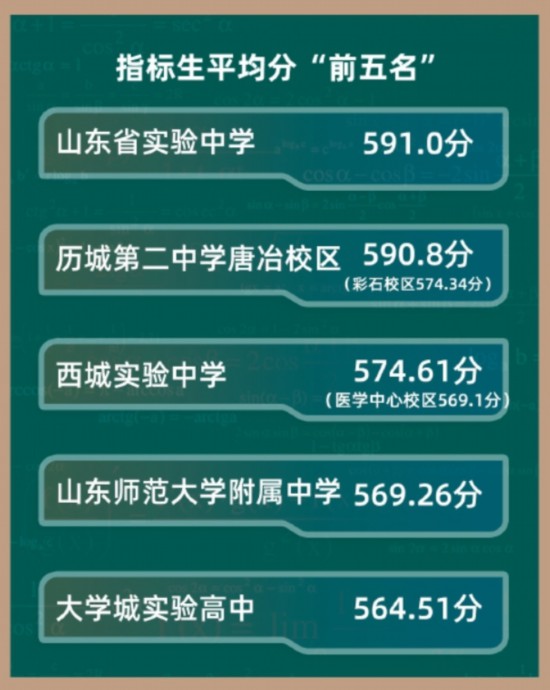 今年面向市區(qū)招生的高中學(xué)校指標(biāo)生平均分“前五名”分別為:山東省實(shí)驗(yàn)中學(xué)591.0分;歷城第二中學(xué)唐冶校區(qū)590.8分(彩石校區(qū)574.34分);西城實(shí)驗(yàn)中學(xué)574.61分(醫(yī)學(xué)中心校區(qū)569.1分);山東師范大學(xué)附屬中學(xué)569.26分;大學(xué)城實(shí)驗(yàn)高中564.51分。