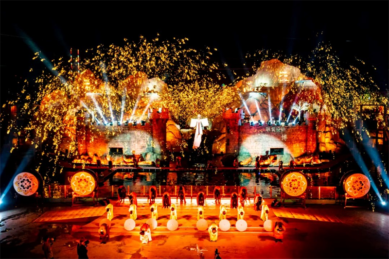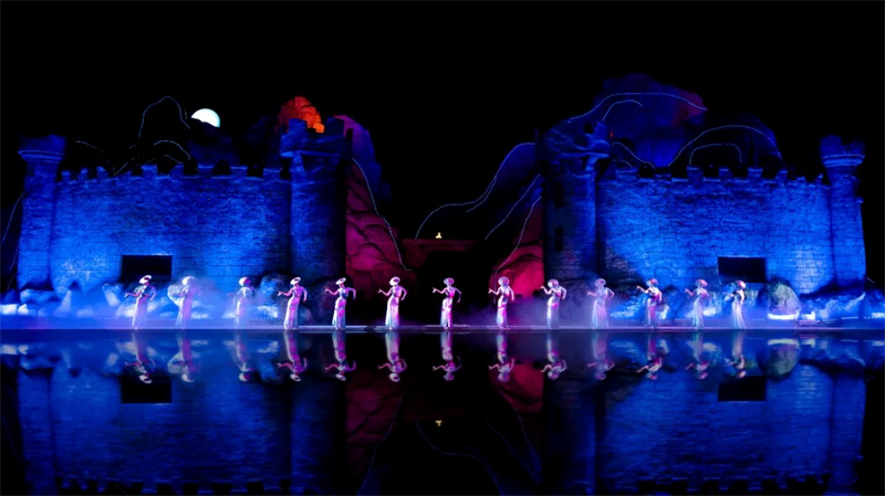 演出中,各種全新科技手段在此也得到了完美應用。在觀演現(xiàn)場,游客可見14米高空威亞穿梭,300臺燈光、近千臺特效設備,水幕投影、水火特效、數(shù)控噴泉、激光表演、無人機表演等科技手段,將“人、聲、光、水、電、影、景”融合。