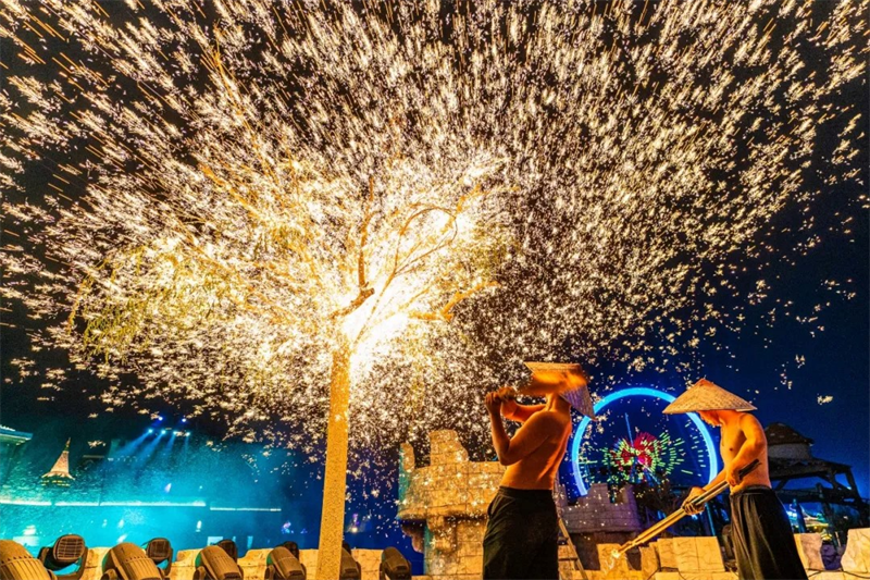 作為濟南融創(chuàng)文旅城暑期重頭戲之一,《夢回西樓》大型國風實景鐵花秀是以濟南深厚的歷史文化為背景,將非遺鐵花、舞蹈、武術表演與多種高科技舞臺技術手段相結(jié)合,并將二安詩詞意境和情感融入到整部演出中的國風大秀。這個節(jié)目如今已是游客必到的“打卡地”、連續(xù)兩周演出場場滿座,周末更是需要加場演出以滿足游客需要。