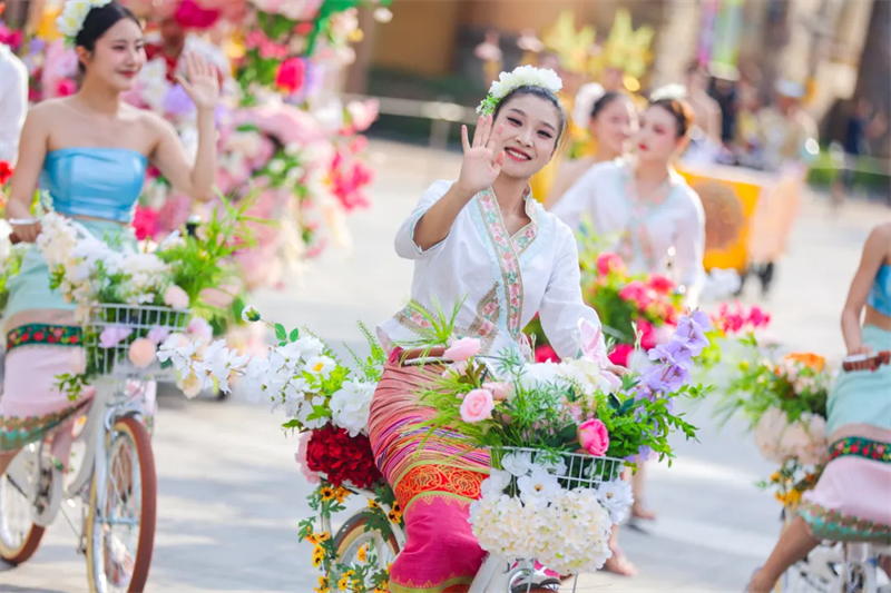 每天下午2點及5點,隨著歡快的象腳鼓和铓鑼聲響起,傣家潑水狂歡大巡游開始了。6大主題花車方陣,近百名演員身著各具特色的民族服飾,穿梭于8個精心設計的潑水互動點之間。高顏值NPC,騎著滿是鮮花自行車的傣家小妹,讓游客一秒來到西雙版納潑水節(jié)現(xiàn)場。