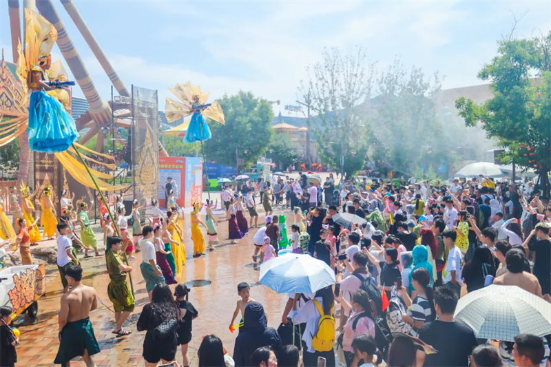 在互動潑水模式開啟后,圍觀的游客們不論年齡大小,男女老少,紛紛加入潑水行列,歡笑聲、音樂聲、潑水聲通通交織在一起,所有人在這里釋放激情,傳遞祝福,享受著潑水節(jié)帶來的歡樂。