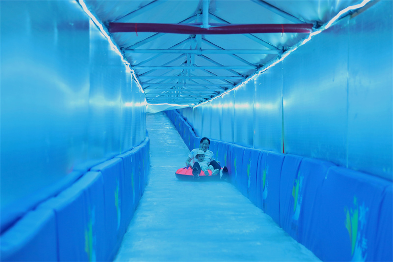 此次世博園雙節(jié)聯(lián)動,最令人期待的莫過于國內(nèi)首個夏季戶外真冰雪項目“冰雪幻城”。該項目位于世博園二號門云橋區(qū)域,由南向北設(shè)置了飄雪大道、童趣冰樂園、急速冰滑道等體驗場景。