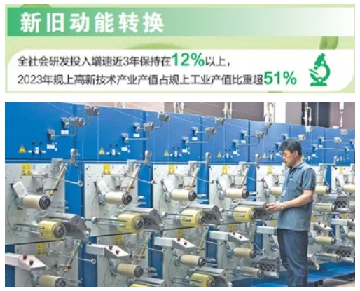 深化新舊動能轉(zhuǎn)換。統(tǒng)籌優(yōu)化傳統(tǒng)產(chǎn)業(yè),壯大新興產(chǎn)業(yè),布局未來產(chǎn)業(yè),全社會研發(fā)投入增速近3年保持在12%以上,2023年規(guī)上高新技術(shù)產(chǎn)業(yè)產(chǎn)值占規(guī)上工業(yè)產(chǎn)值比重超51%,經(jīng)營主體達(dá)1474萬家。