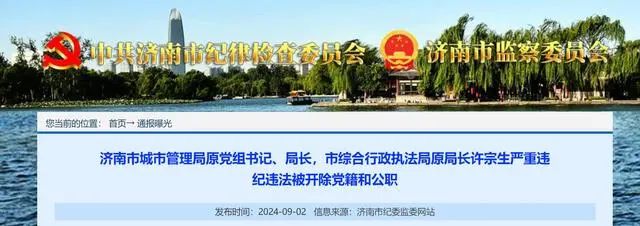 9月2日,濟南市紀委監(jiān)委微信公號“泉城清風”發(fā)布消息,依據(jù)相關(guān)規(guī)定,經(jīng)濟南市紀委常委會會議研究并報濟南市委批準,決定給予濟南市城市管理局原黨組書記、局長,市綜合行政執(zhí)法局原局長許宗生開除黨籍處分;由濟南市監(jiān)委給予其開除公職處分。